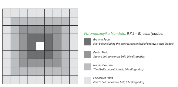 In sacred geometry and in the ancient Indian science of architecture the concept of Mandala is vital. Mandala is energy grid divided into a set of number of cells or grids called Pada. This serves as a model for the organizational structure and a tool for manifestation. Among the different mandalas mentioned in the ancient texts, the one with nine equal parts resulting in a total of 81 parts (padas) is termed as the Paramsayika Mandala; which facilitates orderly arrangement of spaces in the material world. The square form represents balance and peace oriented to the cardinal directions. It serves as a material grid manifesting into an outward form creating balance and fulfillment.